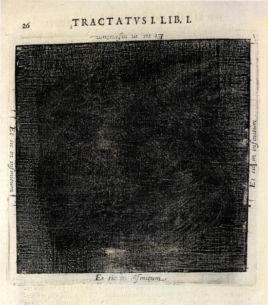 In the first volume of "Metaphysical, and Natural and Art History of both Worlds, namely the Macrocosm and the Microcosm" of his story of the macrocosm the english doctor and natural philosopher Robert Fludd has visualized a genesis, which starts with the archetype or primary image of the hyle, the equivalent to the nothing or void, as a black rectangular (see cover page).